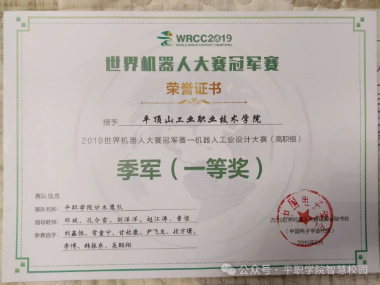 3.学生获2019世界机器人大赛冠军赛机器人工业设计大赛高职组一等奖(季军),指导老师:孔令雪。