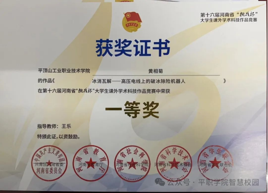 1.2023年机电学院王乐老师指导学生参加第16届河南省“挑战杯”大学生课外学术科技作品竞赛,获得一等奖