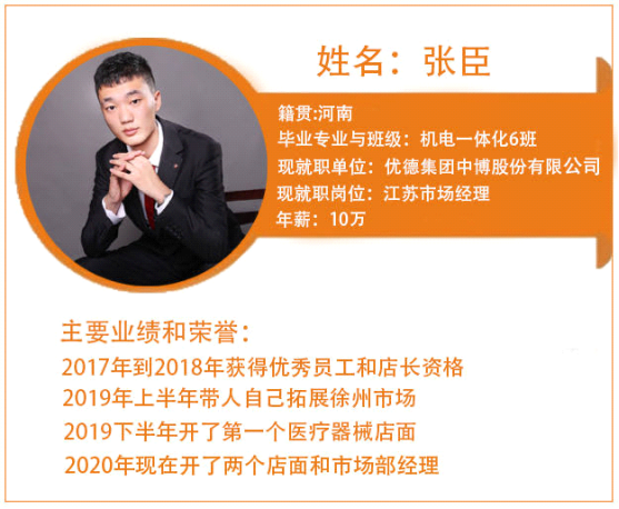 张臣,2015级机电一体化6班学生。现就职于优德集团中博股份有限公司,目前在江苏市场部认经理职位,工种开拓市场,策划店内经营,月薪10000+。