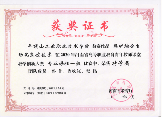 9.教师鲁佳、尚姝钰获2020年河南省高等职业教育青年教师课堂教学创新大赛(专业课程一组)特等奖。