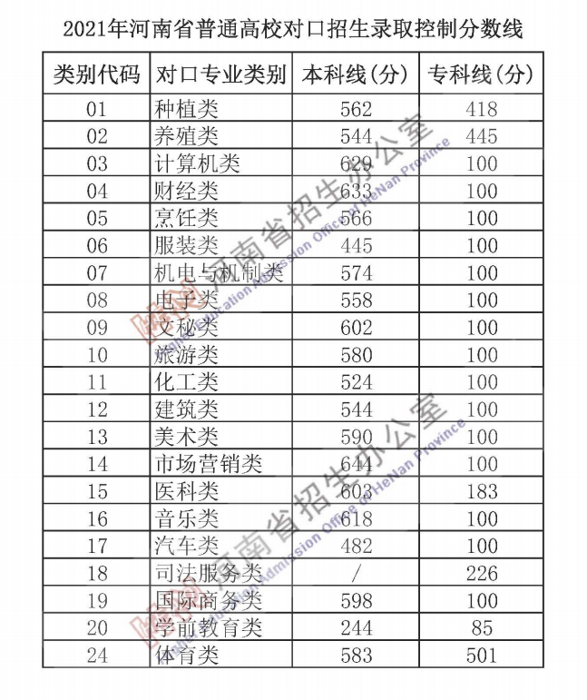 2021年河南省普通高校对口招生录取控制分数线