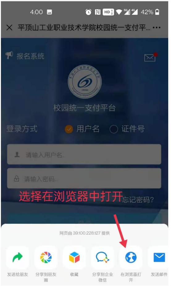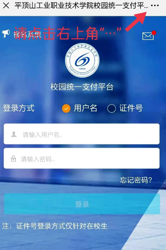 返回至“平职学院智慧校园”微信公众号主页面,点击右下角的“学生缴费”菜单,点击两次“继续访问”,然后请点击右上角“... ”,选择在浏览器打开,进入“校园统一支付平台”。