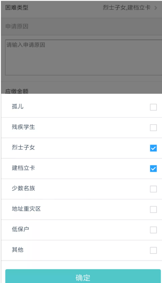 选择家庭困难类型、填写申请原因,选择缴费措施、填写贷款金额、家庭电话、家庭收入来源、家庭收入、家庭地址,上传佐证材料。点击确定,完成申请。等待审批后完成缴费。