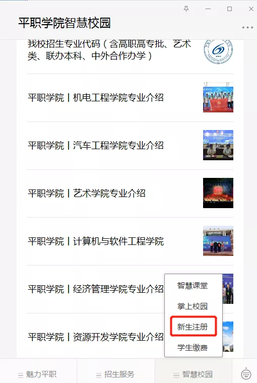 微信扫描《2021新生入学指南》上的二维码,关注“平职学院智慧校园”微信公众号,点击右下角“新生注册”菜单。