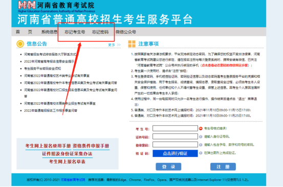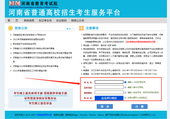 进入考生服务平台后,请仔细阅读“信息公告”区、“注意事项”区发布的政策公告和注意事项。