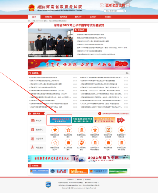 点击跳转进入河南省教育考试院官网,点击如下图示位置,进入“河南省普通高校招生考生服务平台”(https://pzwb.haeea.cn/)系统。