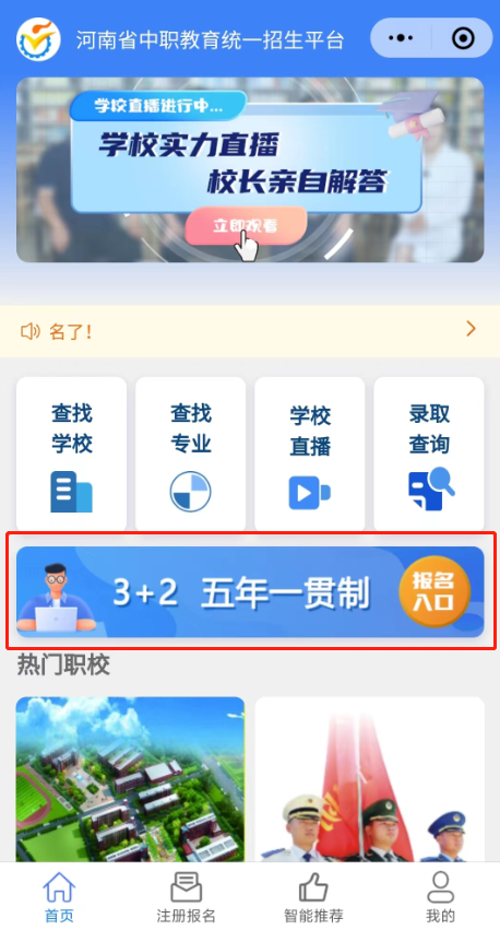 接上级部门最新通知,2023年我省“3+2”分段制高职、五年一贯制高职通过“河南省中等职业教育统一招生平台”微信小程序报名,报名端口开放截止时间为8月8日下午18时,从8月4日起考生报名成功后将不可取消。